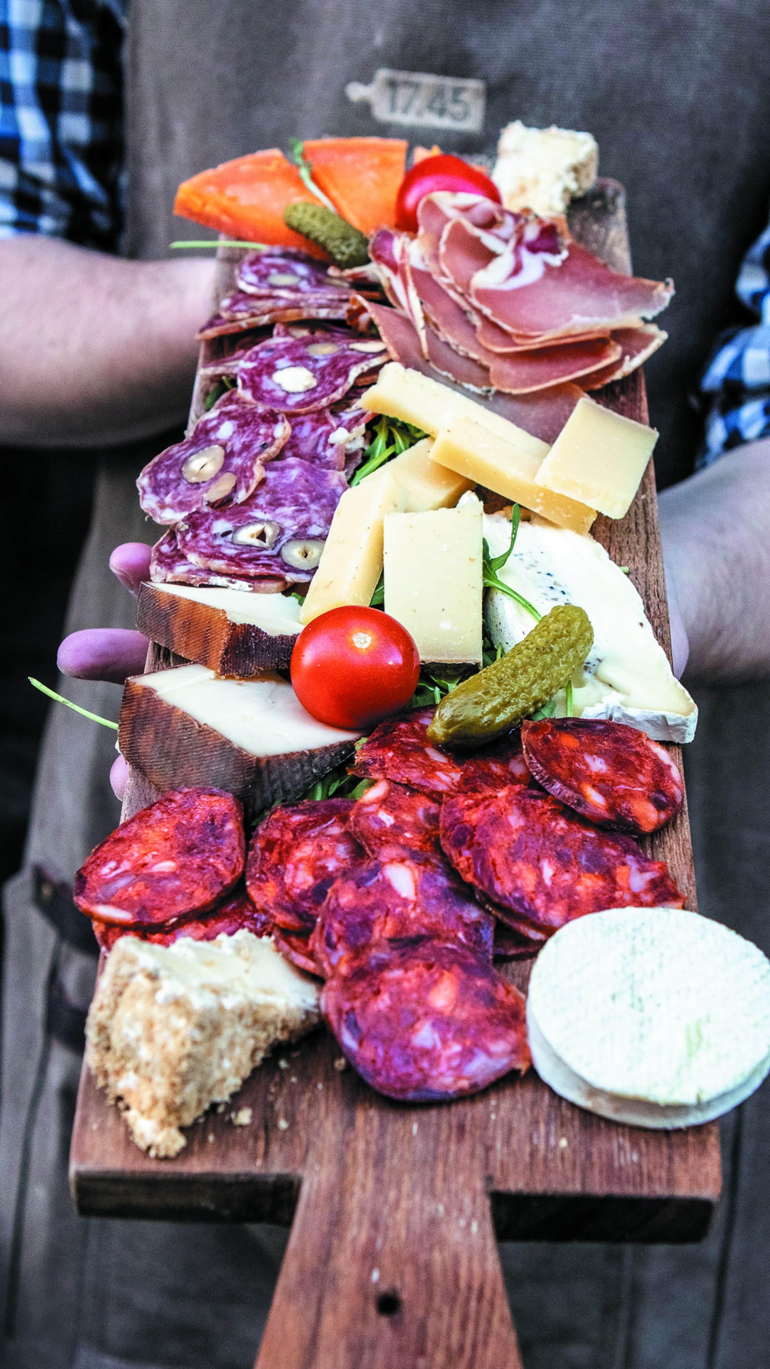 Il faut dire que l’idée est bonne. Il vous suffit de cocher sur une feuille les produits qui composeront votre planche apéro et le tour est joué. La description des produits est indiquée noir sur blanc, impossible de se tromper. Au menu : 20 fromages, 20 charcuteries et une grande sélection d’accompagnements. On retrouve alors de la tomme fermière, de la tête de moine, du gouda à la truffe, du filet mignon fumé, du jambon persillé, des rillettes… Bref, le meilleur de nos terroirs sur une seule planche. La franchise, qui travaille avec des produits de saison, s’approvisionne majoritairement en France. De son côté, Clément s’est rapproché d’acteurs locaux, notamment pour le vin et les bières, qui accompagnent parfaitement l’afterwork. Pendant l’automne, vous pourrez alors découvrir toute une variété de camemberts rôtis. « Même les vegans ne sont pas en reste et pourront composer des planches à base de crudités ». Comme quoi, il y en a pour tous les goûts. Et pour les plus indécis, des planches déjà prêtes sont aussi proposées à la carte. Enfin, que les amateurs de sucré se rassurent, ils n’ont pas été oubliés non plus avec des entremets citron meringué, tiramisus et desserts choco-noisette. Parlons du cadre maintenant. « Ici, nous avons trois salles, trois ambiances, explique Clément en nous faisant découvrir les lieux. Avec une première partie restaurant, une petite cour intérieure et un salon privé à l’arrière. » Banquettes, canapés, tabourets, mange-debout : la décoration aux notes boisées et végétales est un appel aux soirées qui se prolongent jusqu’au bout de la nuit. « Lors des événements privés, le restaurant se transforme même en piste de danse pour finir la soirée en beauté. » Le tout dans une atmosphère chaleureuse et cosy. Pour ceux qui souhaitent profiter d’un apéritif sans sortir de chez eux, c’est aussi possible en se faisant livrer les planches via le site internet ou en ramenant des produits de la petite épicerie signée le 17.45.
